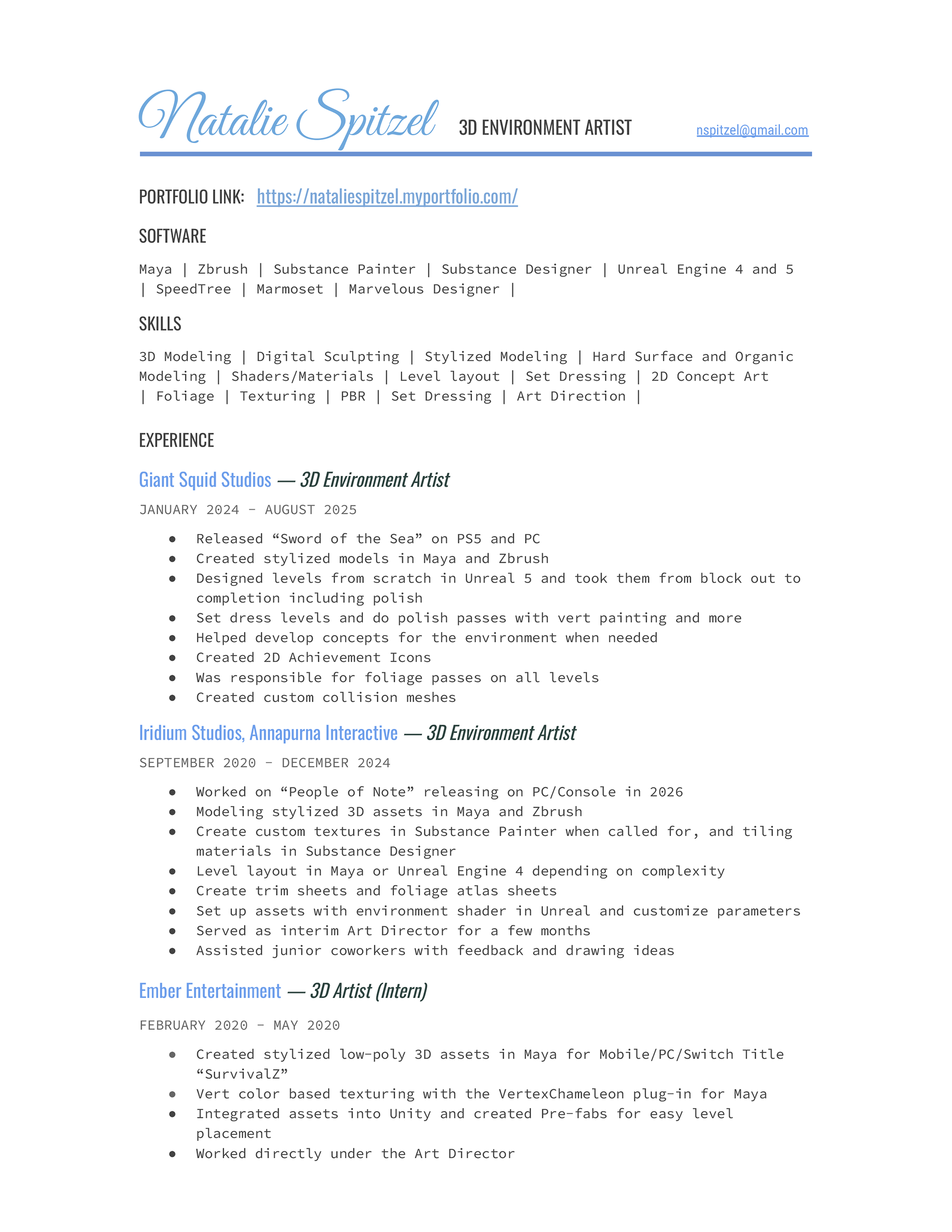 I'm Natalie, a 3D Environment Artist with 5+ years of experience in the games industry. I specialize in Stylized art, but I am a flexible artist that can work in any style you need! My favorite aspect of my work as a 3D Environment Artist is creating models and spaces that seamlessly weave the game narrative into the world I am creating. From the smallest prop to the largest hero piece, each creation is an opportunity to further immerse the player into the story we want to tell.
